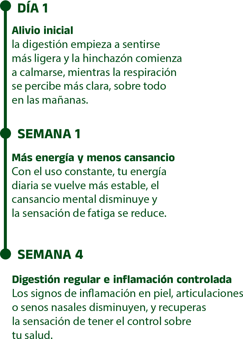 La mayoría de las personas nota mejor digestión, más energía y menos inflamación en 3 a 7 días. El uso constante potencia los resultados de forma progresiva.