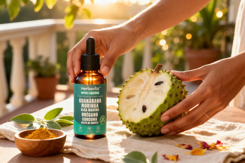 Nuestras Gotas Orgánicas de Guanábana 10 en 1 son un suplemento natural potente, elaborado con extractos de guanábana, moringa, cúrcuma, orégano y más.